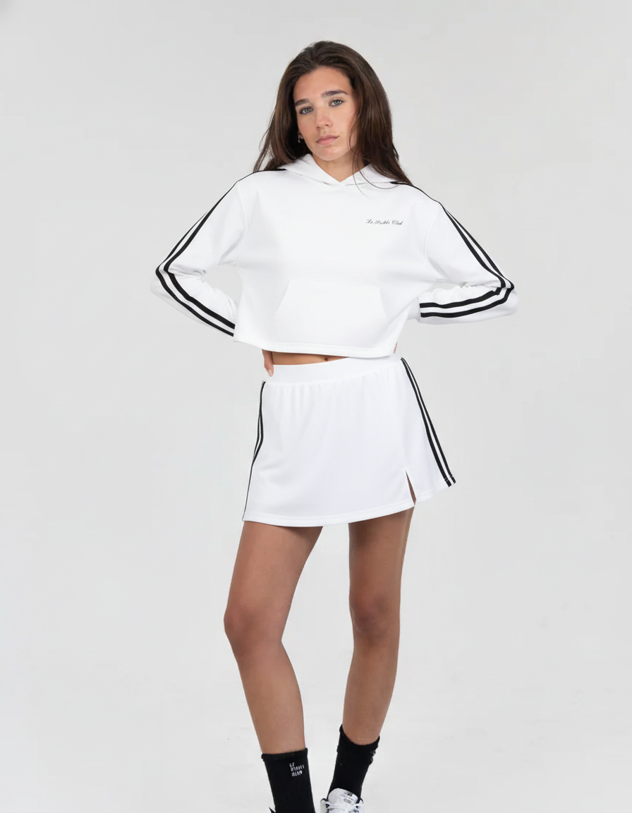 Elevate your everyday fit with this fashion-forward midi skirt, featuring a bold side slit and signature contrast tape accents. Designed to pair perfectly with our track jacket, this piece offers a unique blend of feminine edge and athletic comfort.